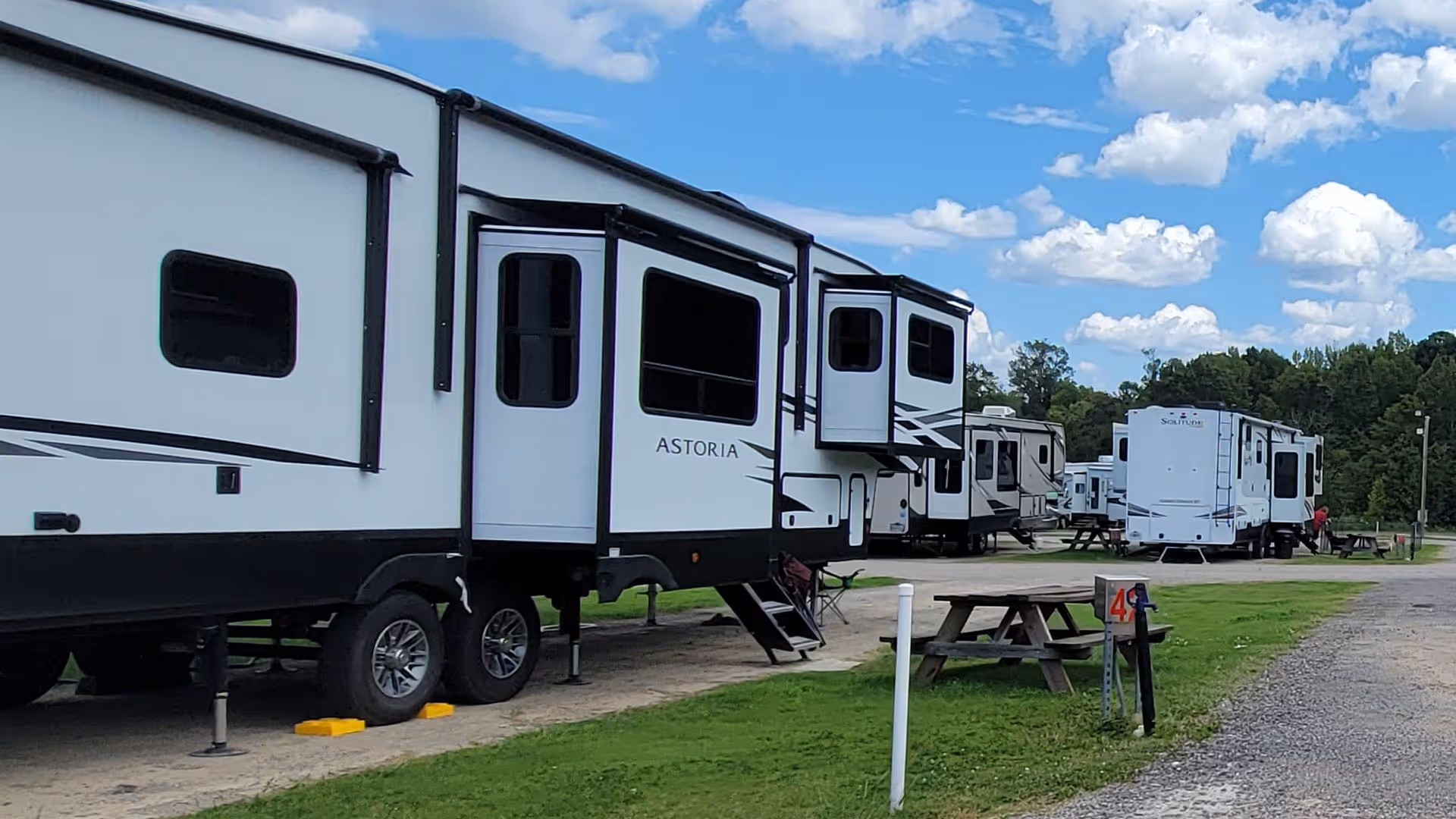 Value sites are designed for self-contained RVs, including motorhomes, travel trailers, fifth wheels, and camper vans that can connect to water, sewer, and 50 AMP power.