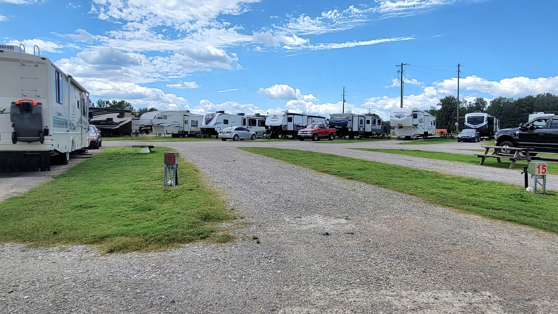 Value sites are designed for self-contained RVs, including motorhomes, travel trailers, fifth wheels, and camper vans that can connect to water, sewer, and 50 AMP power.